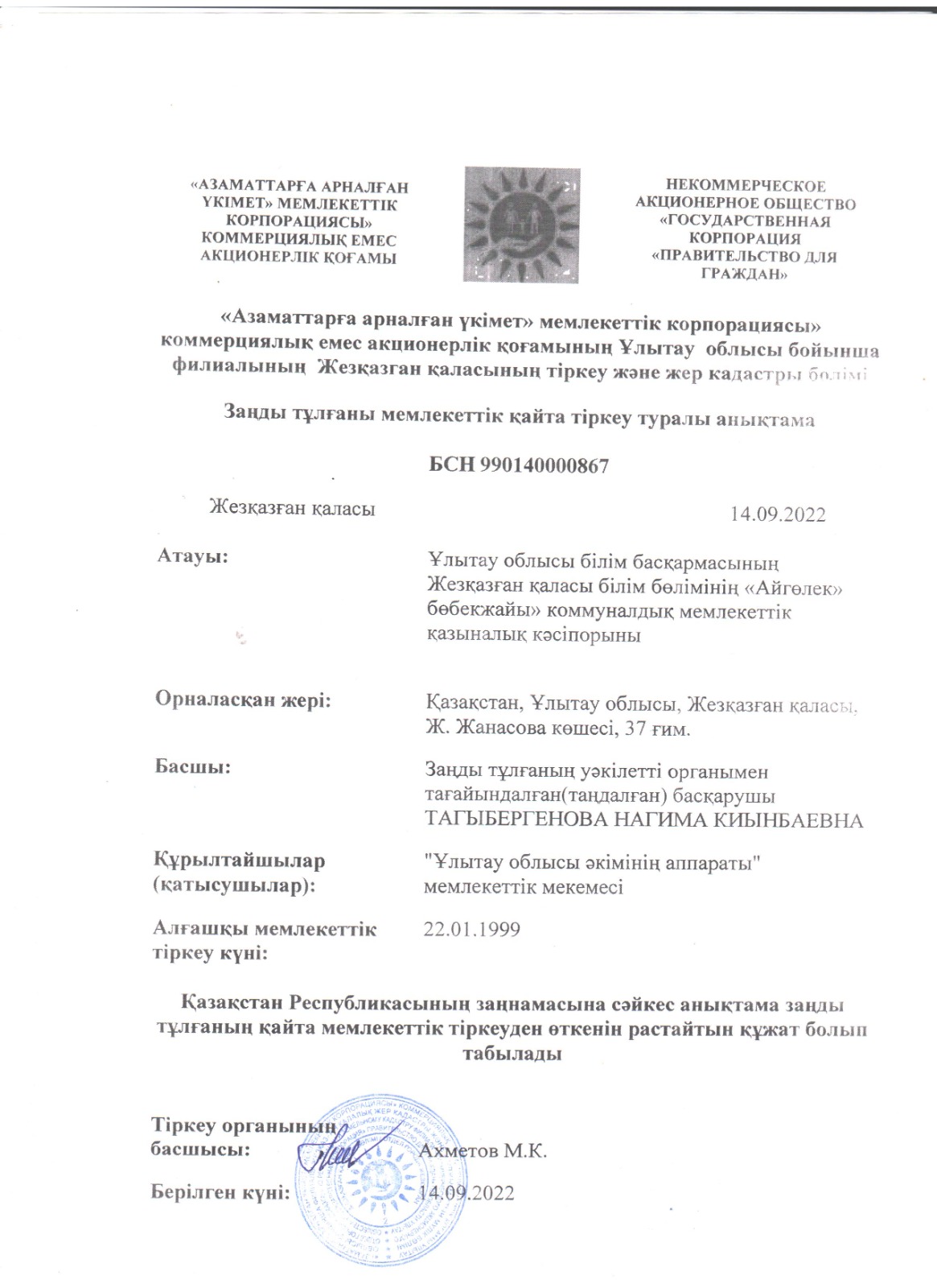 Мемлекеттік кәсіпорынның құрылтайшысы: «Жезқазған қаласының білім бөлімі» ММ